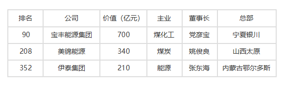 煤炭及相關(guān)領(lǐng)域共有3家企業(yè)上榜《2019胡潤中國500強(qiáng)民營企業(yè)》。分別是寶豐能源集團(tuán)以700億元,排名第90位;美錦能源以340億元,排名第208位;伊泰集團(tuán)以210億元,排名第352位。