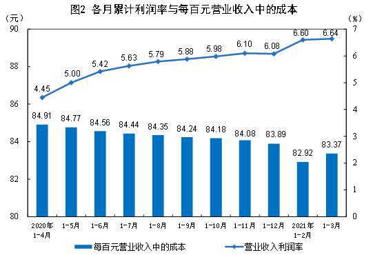 1—3月份,規(guī)模以上工業(yè)企業(yè)實(shí)現(xiàn)營業(yè)收入27.48萬億元,同比增長38.7%;發(fā)生營業(yè)成本22.91萬億元,增長36.5%;營業(yè)收入利潤率為6.64%,同比提高2.76個(gè)百分點(diǎn)。